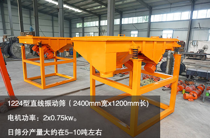 1224型直線振動(dòng)篩(2400mm寬x1200mm長),電機(jī)功率:2x0.75kw。日篩分產(chǎn)量大約在5-10噸左右。