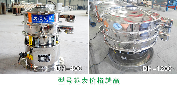 不銹鋼振動篩型號有:DH-400、DH-600、DH-800、DH-1000、DH-1200、DH-1500、DH-1800、DH-2000等八種型號,不同的型號選用的振動電機也不同,型號越大電機功率就越高價格也就越高,每個型號之間相差600-3000元不等。