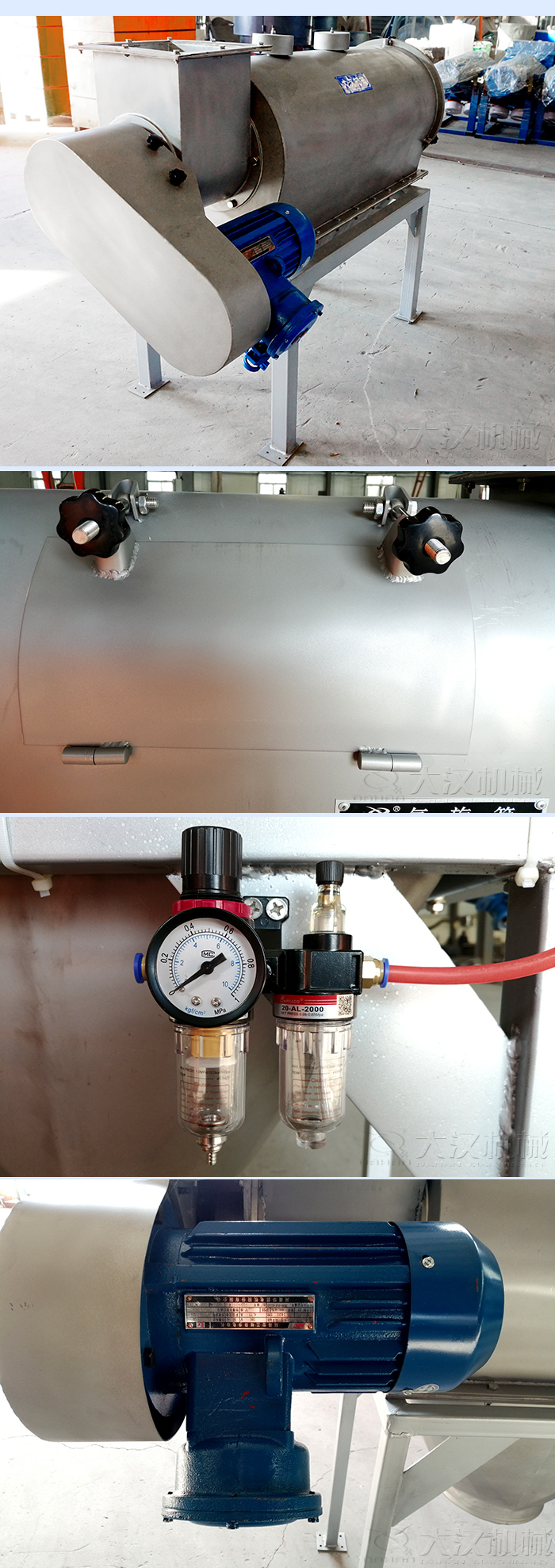 淀粉臥式氣旋篩篩網(wǎng)為圓筒狀,置于機體內(nèi),物料通過螺旋輸送系統(tǒng)后,和氣流混合、霧化進(jìn)入網(wǎng)筒內(nèi);通過網(wǎng)筒內(nèi)風(fēng)輪葉片使物料同時受離心力和旋風(fēng)推進(jìn)力,從而迫使物料噴射過網(wǎng),由細(xì)料排出口排出,不能過網(wǎng)的物料沿網(wǎng)筒壁從粗料排出口排出。