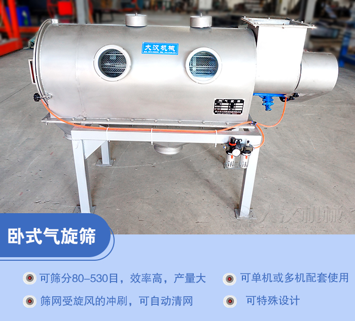 淀粉臥式氣旋篩可對細(xì)度范圍在80-500目內(nèi)的粉狀物料很好的連續(xù)篩分,篩網(wǎng)可任意更換,材質(zhì)上分為不銹鋼材質(zhì)與碳鋼材質(zhì)兩種,通過在密閉狀態(tài)下利用高速氣流作載體,使充分?jǐn)U散的粉料微粒以足夠大的動能向篩網(wǎng)噴射,達(dá)到分級目的。特別適合篩分處理輕比重、粘度大、纖維多、有靜電、易團聚的微粉和特殊物料。